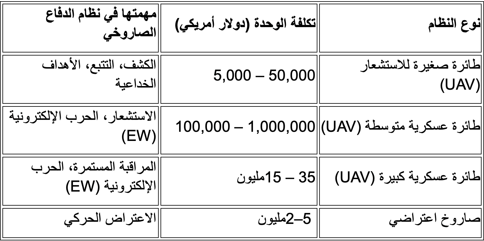 الجدول 1: التكاليف التقديرية للوحدة وأدوار نظم الدفاع الصاروخي